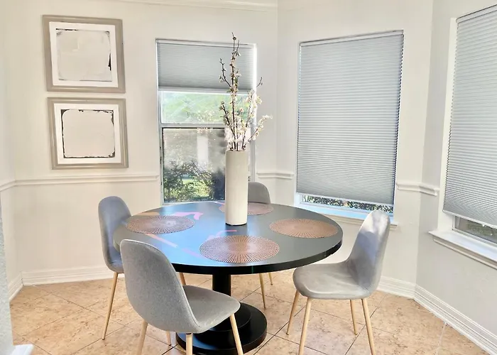 La villa de 186 m^2 Modern Chic Home se trouve à 3 km en partant de Galena Park Independent School District Stadium et dispose d'une thérapie spa, des espaces de pique-nique et des espaces de jeux. Il y a des chambres avec un pupitre d'écriture, une cafetière/théière et un coin salon dans la villa.